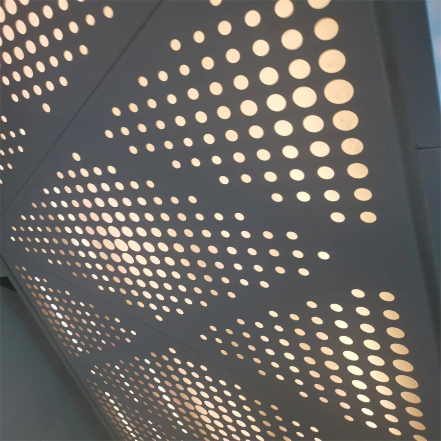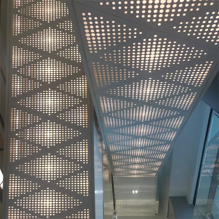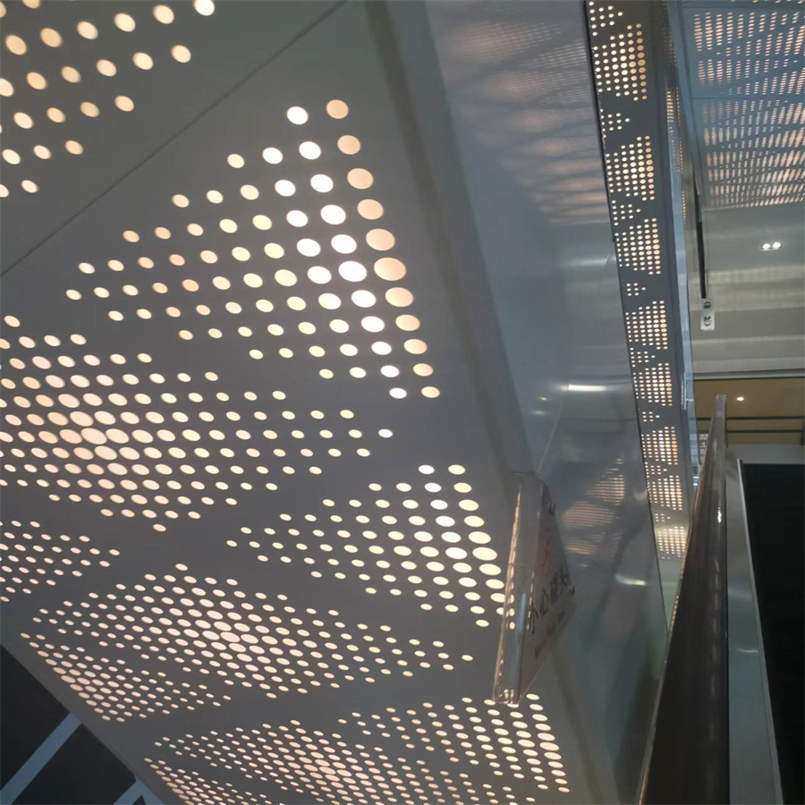 這位老板是采用我廠磚塔衝工藝做的吊頂小黄片免费观看板材質為鋁合金材質優點是輕不生鏽對客人在極端情況下安全好不容易傷到人,衝壓好後在折彎到了現場拚裝目前從圖片效果看特別美觀吧,圖案為大小孔組成,裏麵有暗燈,整體氣場讓商場提高檔次感現代化感覺有喜歡的客戶聯係我廠采購