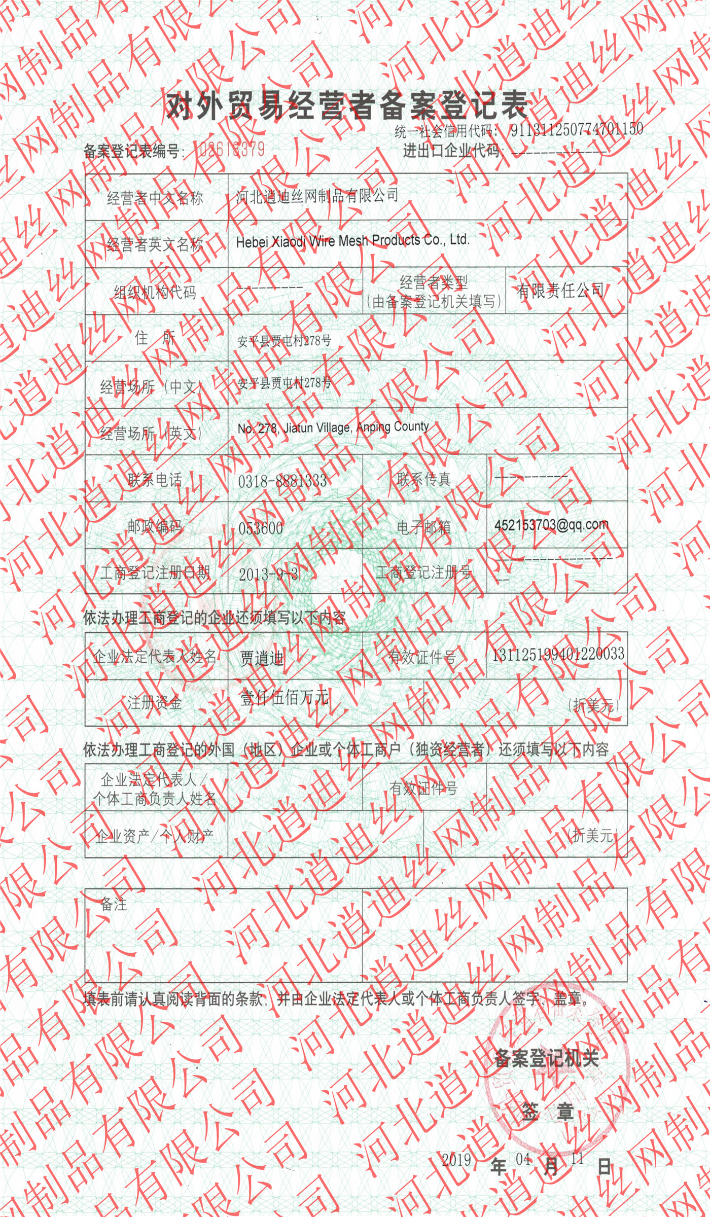 備案登記機關:對外貿易經營者備案登記 河北安平